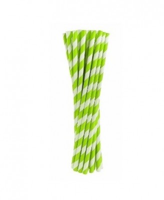 Pack de 24 palhinhas de papel descartáveis na cor branca com riscas diagonais em cor verde.