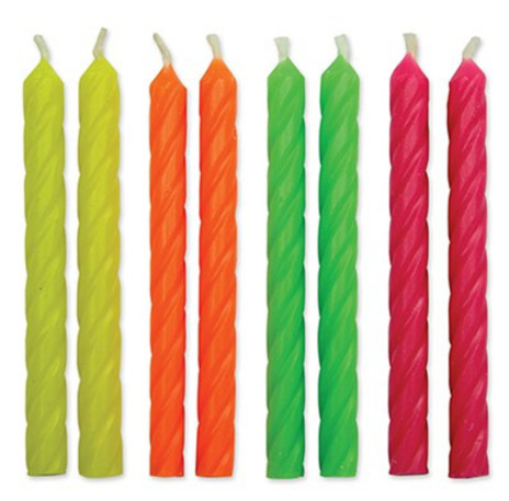 Dê o toque final aos seus bolos com este conjunto de 24 velas em espiral com cores Neon. 6 velas de cada cor: amarelo, laranja, verde e rosa.