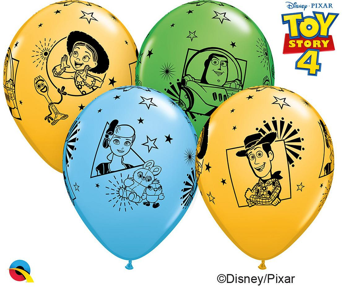 Saco de 25 balões de latex do Toy Story 4 da Disney com as várias personagens e com balões em tons de amarelo torrado, verde e azul da Qualatex. Ideal para decorar qualquer festa temática do Toy Story.