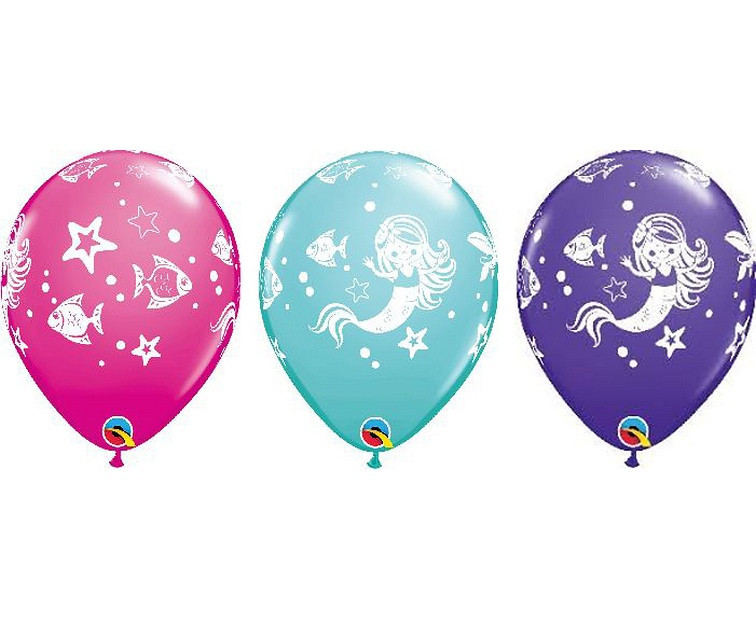 Saco de 25 balões com sereias em três tons, rosa, azul e roxo da Qualatex. Ideal para decorar qualquer festa temática de sereias.