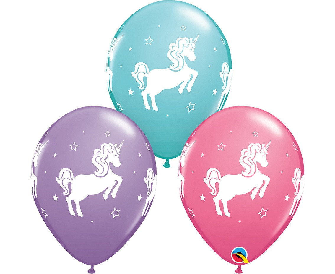 Saco de 25 balões com unicórnios em três tons, rosa, azul e roxo da Qualatex. Ideal para decorar qualquer festa temática de unicórnios.