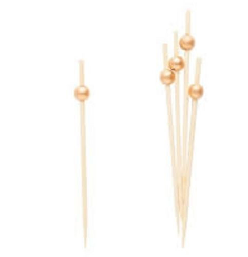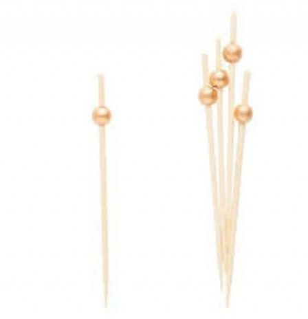 Embalagem com 25 palitos em bamboo para aperitivos com pormenor de bola em dourado.