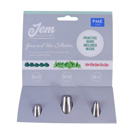 O conjunto inclui: Boquilha nº 233 - Para criar relva realista para bolos temáticos de futebol e mais; Boquilha nº 22 - Use para fazer espirais e conchas com vários materiais, Boquilha nº 235 - Crie cabelos realistas para bolos.