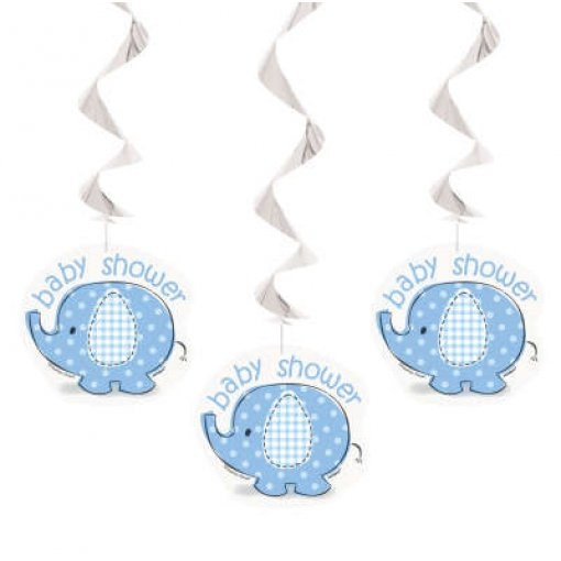 Embalagem com 3 espirais decorativas para decoração do baby shower da sua bebé em tons de azul com elefantes.