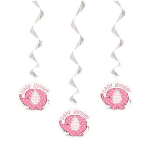 Embalagem com 3 espirais decorativas para decoração do baby shower da sua bebé em tons de rosa com elefantes.