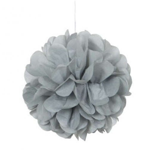 Conjunto de três bolas puff ou pom pom de papel em cinza para decoração de festas e eventos.