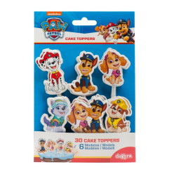 Conjunto de 30 toppers recortados para cupcakes, doces, fingerfoods ou salgadinhos com imagens sortidas da Patrulha Pata, Paw Patrol ou Patrulha Canina. Inclui 6 desenhos sortidos.
