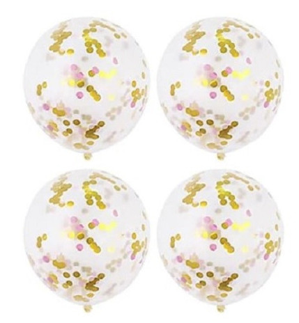 Conjunto de 4 balões de latex com confettis em cor de rosa e dourado no seu interior, para decorar qualquer festa ou evento. Inclui fita cor de rosa.