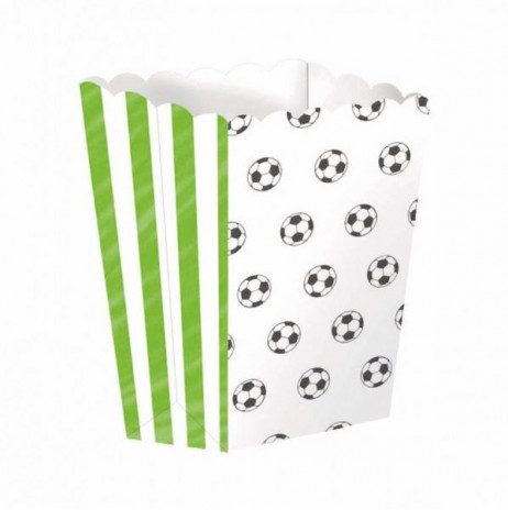 Caixas para pipocas do tema de futebol, com pequena bolas, em preto, branco e verde.