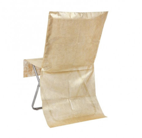 Conjunto de 4 capas cobre cadeiras em poliéster (não tecido) em dourado. Pode adaptar a qualquer tipo de cadeira sem braços. Muito fácil de colocar. Ideal para decorar festas de casamento, batizados e outros eventos.