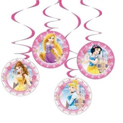 Embalagem com 4 espirais decorativas sortidas com imagens das Princesas da Disney, para tornar a tua festa de aniversario ainda mais animada.