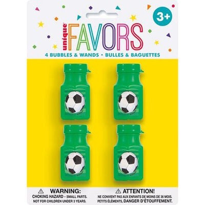Blister com 4 garrafinhas de bolas de sabão ótimas para complementar brindes de aniversário alusivas ao tema Futebol.