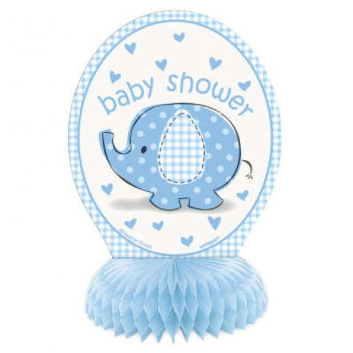 Embalagem com 4 mini centros de mesa para decoração do baby shower da sua bebé em tons de azul com elefantes.