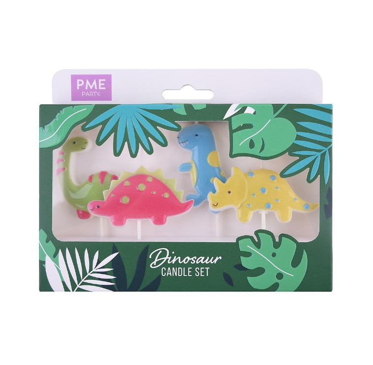 Conjunto de 4 velas de bolo de aniversário do tema Dinossauros, com 4 dinossauros diferentes : T-Rex, Triceratops, Stegosaurus, Apatosaurus
