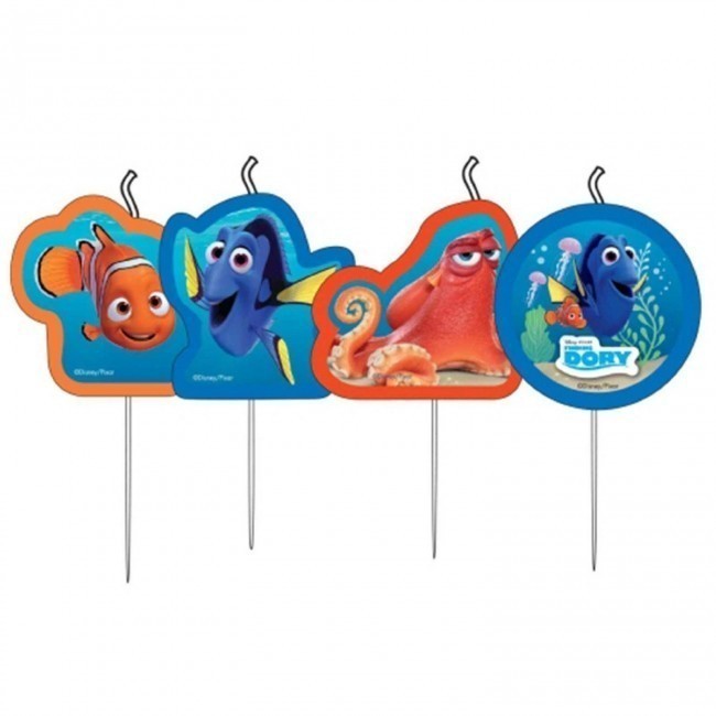 Conjunto de 4 velas palito com imagens da Dory e seus amigos, do filme À procura de Dory, para decoração de bolos de aniversário.