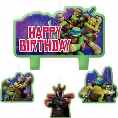 Conjunto de 4 velas com imagens das quatro tartarugas ninja para decoração de bolos de aniversário. 1 vela de 8x5cm "Happy Birthday" mais 3 com imagens das Tartarugas com aproximadamente 3x4cm.