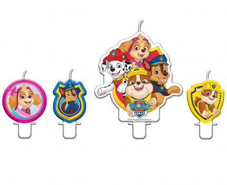 Conjunto de 4 originais e divertidas velas da série Paw Patrol, com o Chase, o Rubble, a Skye e uma vela maior com 4 personagens, Marshall, Skye, Chase e Rubble para colocares no bolo da tua festa de aniversário.