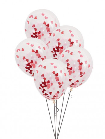 Conjunto de 5 balões transparentes de latex com confettis vermelhos e cor de rosa em formato de coração para colorir a sua festa ou evento especial.
