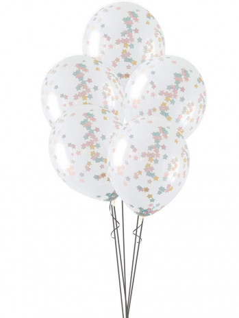Conjunto de 5 balões transparentes de latex com confettis estrelas em dourado, rosa e azul para colorir a sua festa ou evento especial. Ideal também para baby shower.