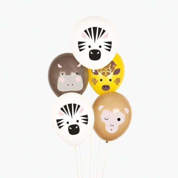 Conjunto de 5 balões de latex de animais da selva, coleção mini safari com 32cm de diâmetro. Pode encher com hélio ou ar.