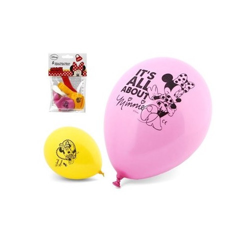Pack de 5 balões em latéx da Minnie da Disney em tons sortidos, rosa, branco, amarelo e vermelho.