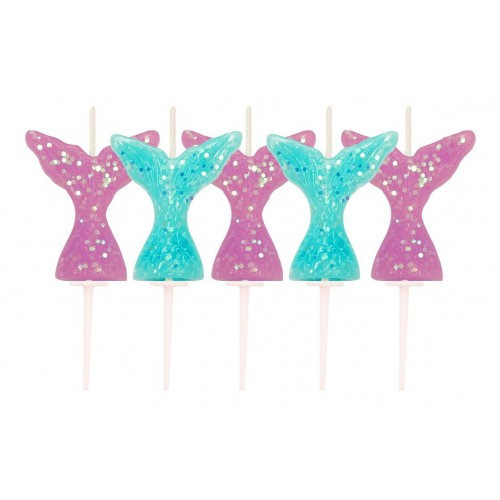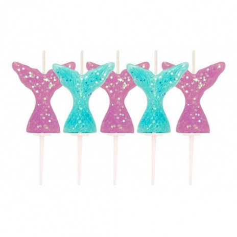 Conjunto de 5 velas de caudas de sereia em duas cores disponíveis, roxo e azul, com glitter para abrilhantar o teu bolo de aniversário com o tema das sereias.