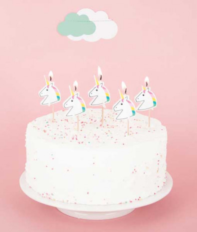 Conjunto de 5 velas para a decoração de bolo da tua festa de aniversário do tema de unicórnio. Com a forma de cabeça de unicórnio.