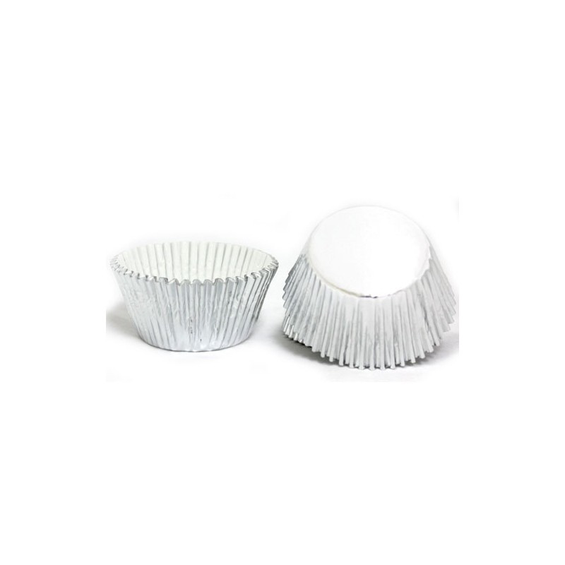 Embalagem com 50 formas de papel em prateado metalizado, perfeito para muffins, cupcakes, brownies e muito mais.