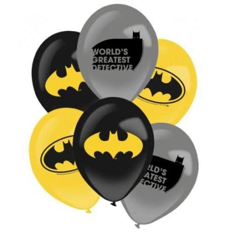 Conjunto de 6 balões em latex do Batman da DC Comics para decorar a tua festa.