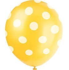 Pack de 6 balões amarelos com bolinhas, em látex, de 30 cm.