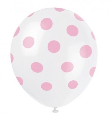 Pack de 6 balões brancos com bolinhas cor de rosa, em látex, de 30 cm.