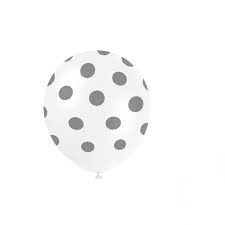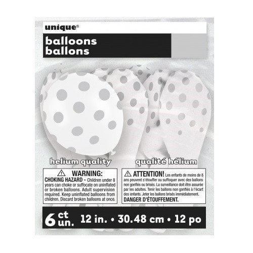 Pack de 6 balões em látex brancos com bolinhas prateadas.