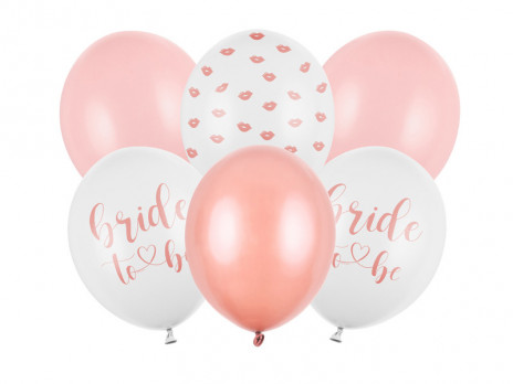 Conjunto de 6 balões para decoração de festa de despedida de solteira. Com três modelos sortidos, lisos, com a inscrição "Bride to Be" e com lábios.