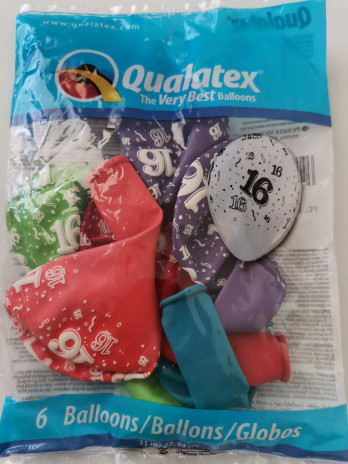Conjunto de 6 balões de cores sortidas em látex, com a impressão do nº 16 (número dezasseis) para festas de aniversário e outros eventos.