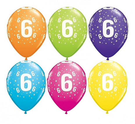 Conjunto de 6 balões de cores sortidas em látex, com a impressão do nº 6 (número seis) para festas de aniversário e outros eventos.