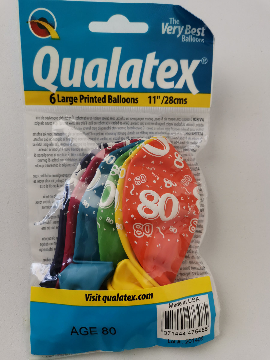 Conjunto de 6 balões de cores sortidas em látex, com a impressão do nº 80 (número oitenta) para festas de aniversário e outros eventos.
