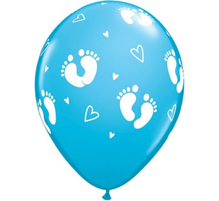 Conjunto de 6 balões de latéx da Qualatex com pezinhos e corações em azul, ideal para baby shower e outras festinhas para o seu bebé.