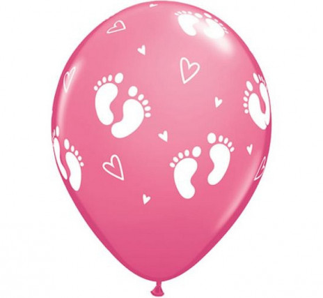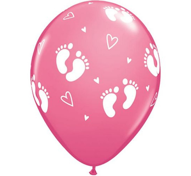 Conjunto de 6 balões de latéx da Qualatex com pezinhos e corações em cor de rosa, ideal para baby shower e outras festinhas para a sua bebé.