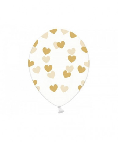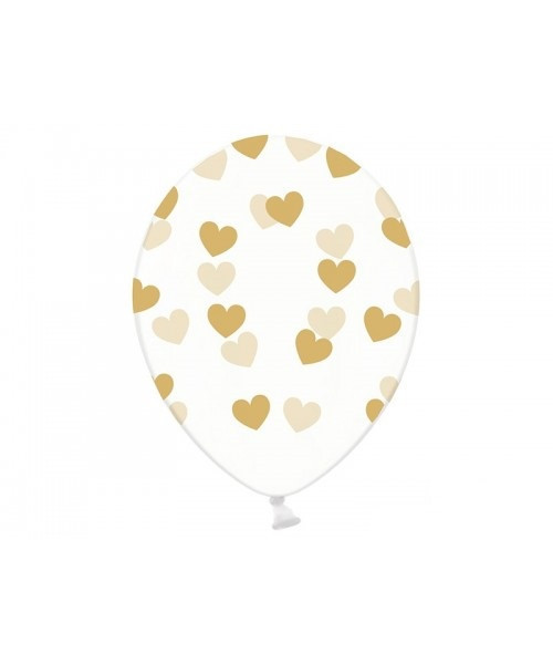 Conjunto de 6 balões de latéx transparentes com corações em dourado, ideal para o dia dos namorados ou qualquer evento amoroso.