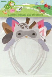 Conjunto de 6 bandoletes plásticas com traços de vários animais da quinta em cartão. Ideal para os teus amiguinhos usarem na tua festa de aniversário.