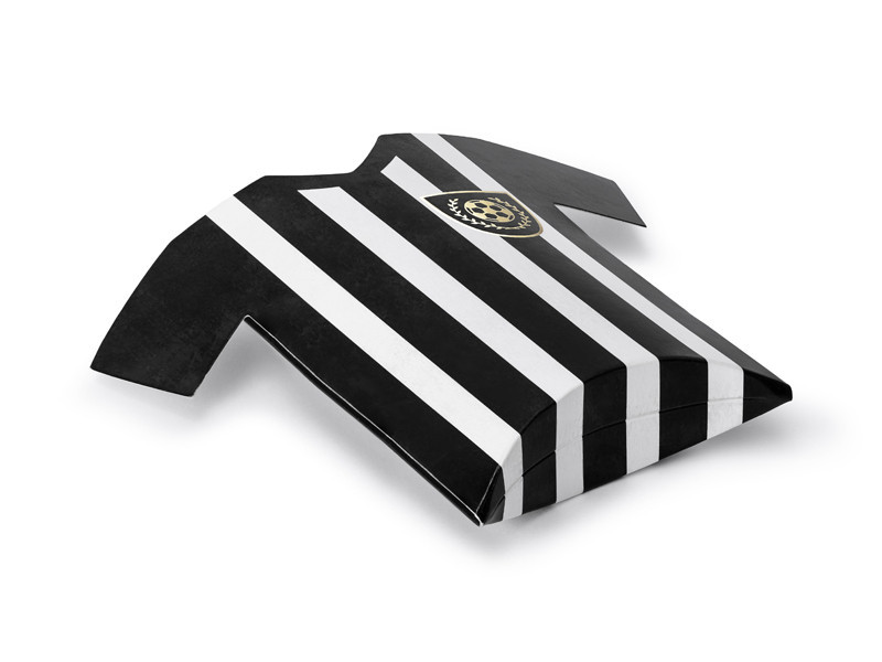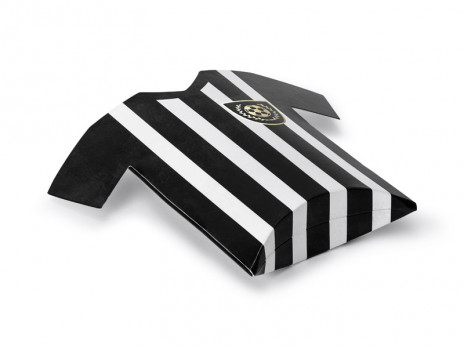 Conjunto de 6 caixas para pipocas e doces em formato de camisola de futebol, com abertura no topo.