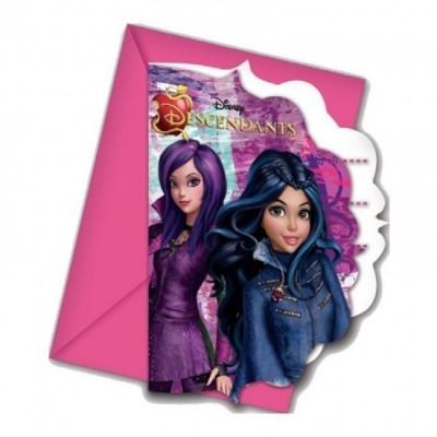 Embalagem com 6 convites para convidares as amigas para a tua festa de aniversário com o tema Disney Descendants com recortes-Inclui envelope Fushia