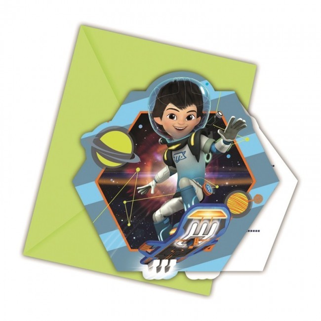 Para informar as festas de aniversário do tema Miles from tomorrow não podia falhar os convites recortados, inclui envelope