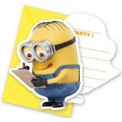 Pack de 6 convites recortados dos Minimos com a inscrição party e linhas para colocares local e data da tua festa de aniversário. Inclui envelope amarelo.