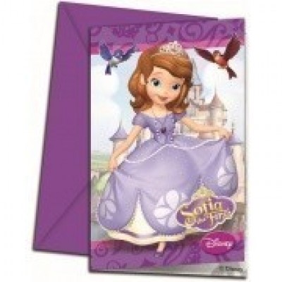 Embalagem com 6 convites + envelopes da Princesa Sofia da Disney, para convidares as tuas amigas para a tua festa de aniversário.Texto interior em espanhol mas perceptivel. Não existe em versão portuguesa.