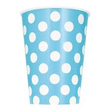 Pack de 6 copos descartáveis na cor Azul claro com bolinhas brancas