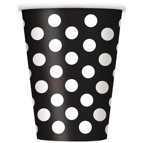 Pack de 6 copos descartáveis na cor preta com bolinhas brancas. Ideal para decoração de qualquer festa de aniversário e/ou evento.