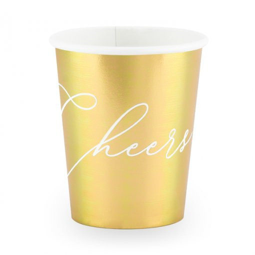 Conjunto de 6 copos papel de festa em dourado com a inscrição "Cheers" para a comemoração do Ano Novo, Natal, festas de aniversário, despedidas de solteira, entre outros.