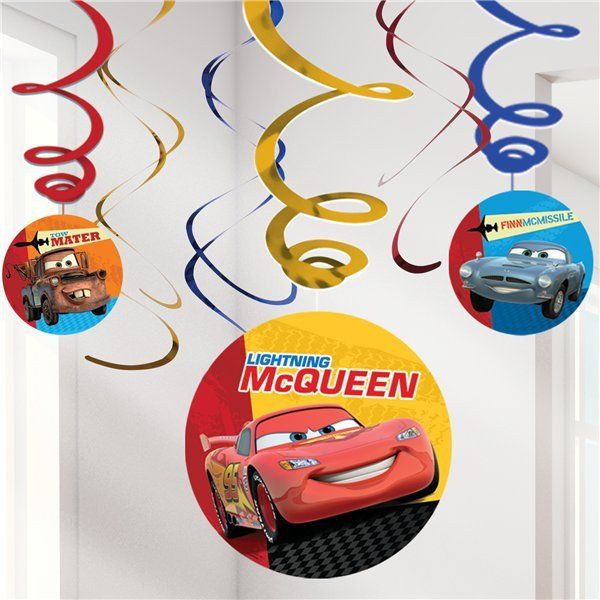 Conjunto de 6 espirais decorativas do Faísca, três com cartão dos Cars e três espirais simples.