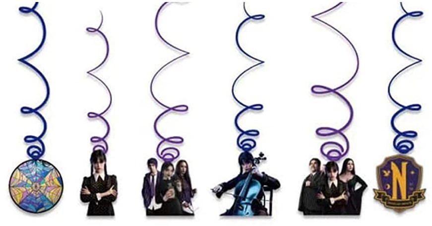 Conjunto de 6 espirais decorativas da série da Wednesday, com várias personagens para decoração.